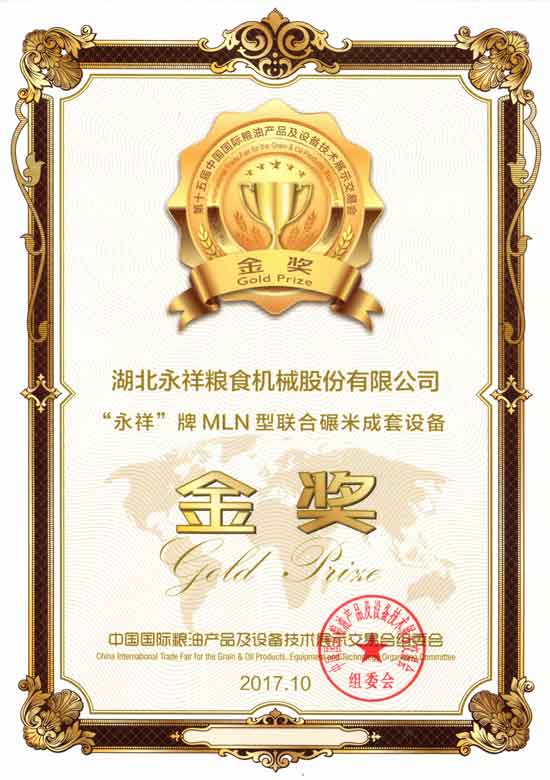 2017年10月,永祥公司生產的成套碾米設備在第十五屆中國國際糧油產品及設備技術展覽會上再獲金獎。